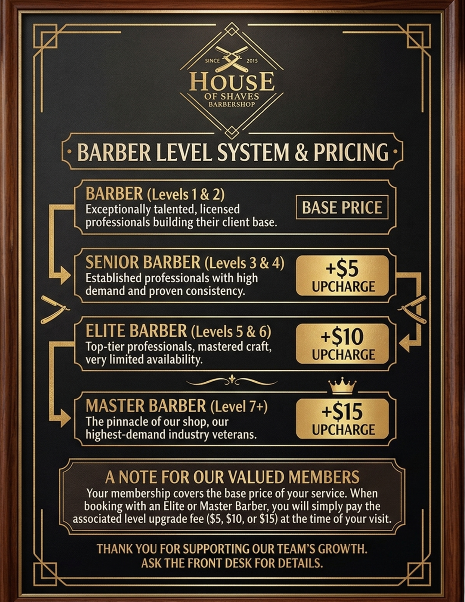 At House of Shaves Barbershop, we believe that when our team grows, your experience gets even better. We want to reward our barbers for their hard work, consistency, and the loyalty they build with you. That is why we operate on a transparent, performance-based level system.